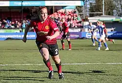 Her performances in the 2013 season were enough to earn a move to Liverpool, where she signed a two-year contract.[8] She also became the first ever winner of the PFA Women's Young Player of the Year award in April 2014.[9] In Harris's first season at Liverpool, they retained their WSL title on the final day of the season.[10] She also represented Liverpool in the UEFA Women's Champions League.