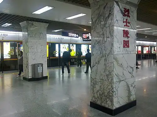 Martyrs' Park Station (simplified Chinese: 烈士陵园站; traditional Chinese: 烈士陵園站; Jyutping: lit6 si6 ling4 jyun4 zaam6; Cantonese Yale: Lihtsih Lìhng'yùhn Jaahm) is a station on Line 1 of the Guangzhou Metro that started operations on 28 June 1997. It is located at the under the junction of Zhongshan 3rd Road and Jiaochang Road East (较场东路) in the Yuexiu District of Guangzhou. It is named "Martyrs' Park Station" because of the nearby Guangzhou Martyrs' Memorial Garden or Guangzhou Martyrs' Memorial Cemetery (广州起义烈士陵园), a park dedicated to those who fought and died in the 1927 Guangzhou Uprising by the Chinese communists against the Kuomintang.[1][2]