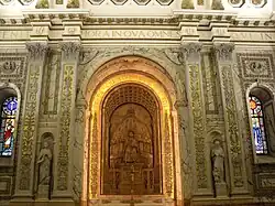• On the side of the tabernacle (west side): "He also converts some people in Spain, in Jerusalem he is condemned to death. He is the first of the Apostles that bears witness to Jesus with his blood." (Latin: "In Hispania aliquos convertit, Jerosolymae capite damnatus est. Primus apostolorum profuso sanguine testimonium Jesu dedit.")