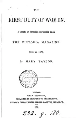 • Taylor, Mary (1870). The first duty of women. A series of articles reprinted from the Victoria Magazine. 1865 to 1870. London: Emily Faithfull, Victoria Press. Text on books.google.com.