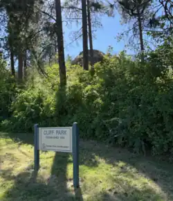 The Cliff Park section of the historic district surrounds the eponymous Cliff Park, a public park that is located not on Cliff Drive, nor along the cliff that runs along the ridge above Marycliff.[13] Instead, Cliff Park surrounds a basalt outcrop that rises over 60 feet above the surrounding terrain[13] and provides sweeping views in all directions.[14] Aside from the outcrop in Cliff Park itself, this section of the historic district is relatively flat. It is located atop the cliff on the southern face of Spokane's South Hill, where the land levels off before beginning to rise steadily again to the south of the district.[13] 14th Avenue serves as the southern boundary and Cliff Drive serves as the northern boundary, beyond which lies the Marycliff section of the district. To the west, the boundary winds along a ridge that drops off to the west and runs along Ben Garnett Way/Grove Street in the east, though there is a salient extending east between Sumner and Cliff Drive for two blocks that is part of the district as well.[6]