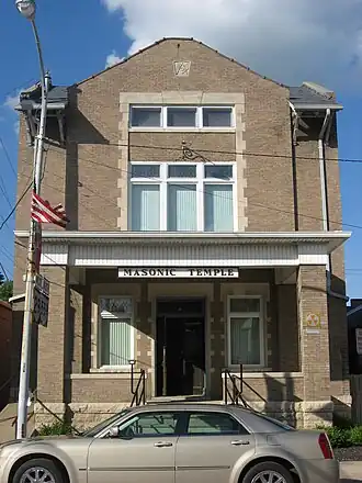 Three stories tall,[6]: 118  the Masonic Temple is a brick building set on a stone foundation. Non-structural elements of stone occupy a prominent part of the exterior,[1] serving as the surrounds for the main door and windows. The roof is gabled,[6]: 118  and while the gable ends face the sides of the building, an additional gable is oriented toward the street. Multi-pane windows in the additional gable provide light to both the second and third stories, while the main entrance and its flanking windows are sheltered by a porch with square brick pillars. Components such as bracketing shaped with knees, additional multi-pane windows with bevelled slats set as transom lights, and buff brick walls combine to lend the building an American Craftsman appearance.[6]: 118  Upon construction, the building's rooms included a club room in the basement, banqueting and reception rooms on the first story, and a lodge meeting room and additional reception space on the second,[3]: 52  and virtually no changes have been made to the building since construction was completed.[6]: 118