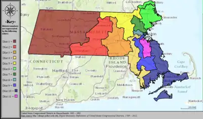 Table of United States congressional district boundary maps in the State of Massachusetts, presented chronologically.[5] All redistricting events that took place in Massachusetts between 1973 and 2013 are shown.