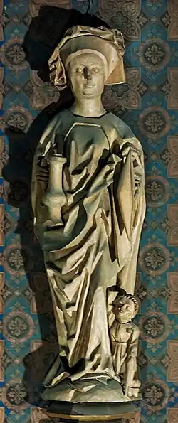 Vykoukal presumes that his workshop employed sculptors trained in Nuremberg, and the head carver of the workshop probably came from Michael Wolgemut's workshop. Swabian inspiration, represented by the late works of Hans Multscher, was also integrated into the Nuremberg tradition. The softly sculpted faces, fashionable female headdresses, the type of cloaks and the rendering of drapery or iconographic scheme link the St. Nicholas sculptures with Michael Wolgemut's Altarpiece of Zwickau (1479).[5][6] Other surviving works, however, have only simplified and rusticated this pattern. Established medieval workshop practice and working according to established patterns does not even allow the individual contribution of individual carvers to be determined. Vykoukal also questions the meaningfulness of identifying the carver by the Madonna of Kamenná Street, which is not one of the finest works in his supposed body of work.[1]