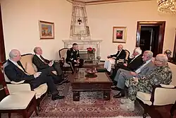 General John F. Campbell, Ambassador P. Michael McKinley and Matthew T. Sherman meet with Afghan President Hamid Karzi and his national security team on 27 August 2014 at the Presidential Palace in Kabul.