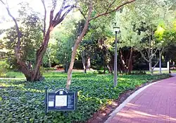 In 1953, instead of organising the annual ballet performance, Mrs Molteno approached the well-known South African actresses Cecilia Sonnenberg and Rene Ahrenson, and invited them to establish Shakespearean seasons.[12][13] The actresses were first uncertain and then declined the invitation later that year. The dance performances therefore began again in 1954 with Don Quixote and Carnaval performed on a wooden stage situated where the seating of the modern stage is now located. The reason for situating the stage in the north-west corner of the park was that since 1952 the badly dilapidated Maynard villa could no longer be used for routing electricity for the stage. The Athlone ladies found that they could access electricity directly from the street poles at the intersection of Church and Wolfe streets and so the stage needed to be close enough to be within reach of their cables.[14][15]