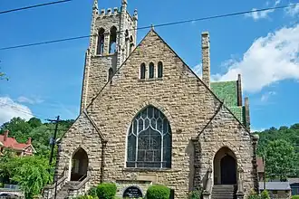 The church was constructed out of native sandstone that was cut and shaped at Thomas Jefferson Mayo's (John Mayo's father) farm, which was located across Paint Creek. The stones were transported to the church by the same aerial tram which Mayo used to construct his mansion. The roof is made of over 12,000 glazed green tiles that weigh six pounds a piece. Its pipe organ was donated by Andrew Carnegie. The church is also well known for its large stained glass windows, designed by Italian craftsman and imported from Italy. The windows portray the Birth, Death, Resurrection, and Ascension of Christ.