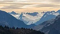 McAllister Glacier is in a large cirque to the north and east of Dorado Needle, North Cascades National Park, in the U.S. state of Washington.[2] The glacier is approximately 1.85 mi (2.98 km) in length, 1.5 mi (2.4 km) in width at its terminus and descends from 8,000 to 4,500 ft (2,400 to 1,400 m), where it terminates near a proglacial lake. McAllister Glacier is nearly connected to Inspiration Glacier to the south and the two glaciers are separated by the arête known as Tepeh Towers. Klawatti Peak and an arete extending north from that peak separate McAllister Glacier from the Klawatti Glacier to the east.[2] Like most glaciers in the North Cascades, McAllister Glacier is retreating and retreated approximately 1350 ft (410 m) between 1975 and 2009.[3]