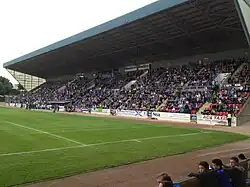 McDiarmid Park, the first purpose-built all-seater stadium in the United Kingdom, consists of four covered, single-tier stands.[8] Facilities include parking for 1,000 cars[3] and 100 coaches, a synthetic playing surface adjacent to the ground[8] (which is used as the team's training ground), and conference facilities within the Main (West) Stand. The stands are all of a similar height, with the Main Stand, on the western side of the ground, being slightly taller. The Main Stand also has greater leg room between rows of seats and includes an area with padded seats reserved for season-ticket holders, club officials and their guests. In the north-east corner of the ground there is a scoreboard, which was upgraded from electronic to digital in 2024.[13] The floodlights at McDiarmid are the same ones used at Muirton Park.[3] The club also tried to retain the square goalposts used at Muirton, but the timber frames could not be re-erected.[3]