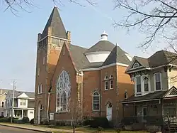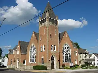 The present church building is a brick Gothic Revival structure with a stone foundation.[9] Two stories tall, it features decorative elements such as stained glass in all of the windows, stone trim around the entrance and the windows, a belfry atop a massive tower at the front, and a central dome.[7] The sanctuary is located on the second story of the building, while the first story is divided into multiple Sunday school classrooms.[5]: 46 Between labor, the lot, and materials, the congregation paid over $28,000 for construction.[4]: 441 The resulting building is typical of the period; like the buildings that other Mechanicsburg churches built around the same time, it reflects the Gothic Revival style that was popular for ecclesiastical architecture during the late nineteenth century. As a result of their sizes and designs, the village's churches are the most prominent components of the built environment,[3]: 8 and because of its location on Main Street, the Methodist Church becomes even more of a landmark than would otherwise be caused by its place as the largest of the village's churches.[7]