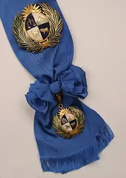 The distinction consists of the medal and the diploma.[3] The medal is characterized by having on its forehead the national coat of arms, made of 24-karat gold-plated metal with dimensions of 65 millimeters high by 60 millimeters wide. Its Sun is carved, the laurel and olive leaves accompany the oval of the coat of arms in half a carved point, and its center have a "bulge", with white and blue enameled colors with a glass finish.[3] The reverse of it contains the text "Oriental Republic of Uruguay" in relief and with a diameter of 41 millimeters, and in the center the text "Medal of the Republic" in relief, straight in three lines.[3]