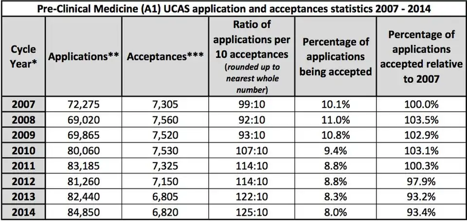 Pre-Clinical Medicine (A1) UCAS application and acceptances statistics, 2007 - 2014.[1][2]