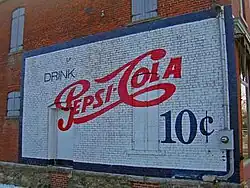 On the northeast wall of the building there is a large advertisement for ten-cent Pepsi drinks, using the old logo. This was not just a decorative touch; the drink was available in the store in three-US-ounce (90 mL) plastic cups for that price. Originally the sign advertised Coca-Cola for five cents, which the store sold starting in 1983; it was a landmark to most visitors arriving at the nearby train station. The store switched to Pepsi and raised the price to ten cents in 2006 after the local Coca-Cola bottler told them they would have to install newer fountain equipment that would make the drinks unprofitable.[3]