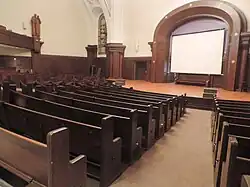 In the same vein as the exterior of the meeting house, the interior of the hallowed space is also plain.[6] The meeting space has a circular arrangement: all the seats surround the center platform in a radial fashion.[6] The center platform, itself, also is different from other religious halls because the platform is barely above the seats, indicating that the speaker, physically and figuratively, comes from where the audience sits, and is not separate and apart from the people.[6] Moreover, the simplicity of the design translates into the details of the exterior, from the lack of finishing on the wood to the undecorated walls.[6] However, like the exterior, the interior is not entirely plain and undecorated: Inside the meeting house, there is a stained-glass window designed by Louis le Vaillant.[6] There are also other stained-glass windows, namely the ones that face out onto Central Park West, which are the most visible to the public.[2]