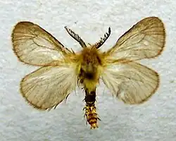 There is strong sexual dimorphism in the adults. Males have a wingspan of 18–22 mm, females reach a length of 9–11 mm and are wingless. Adults are on wing from June to July.