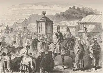 The fifteen-year-old Meiji Emperor, moving from Kyoto to Tokyo at the end of 1868, after the fall of Edo