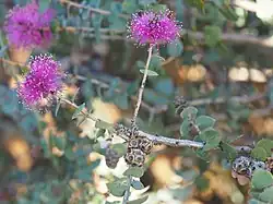 The flowers are deep pink to purplish-red, forming roughly spherical heads of flowers, thickly clustered on or near the ends of the stems. The flowers appear for extended periods from late spring to mid-summer. The fruit which follow flowering are woody capsules about 4 mm (0.2 in) in diameter, arranged in roughly spherical clusters.[2][3]
