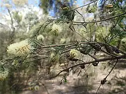 The flowers are arranged in spikes, usually on the ends of branches which continue to grow after flowering. Each spike has between 6 and 55 individual flowers and is up to 30 millimetres (1 in) long and 15 millimetres (0.6 in) wide, white, creamy white or yellow. The petals are 0.7–2.0 millimetres (0.03–0.08 in) long and fall off as the flower ages. The stamens are arranged in five bundles around the flower, each bundle containing between 3 and 11 stamens. Flowering mainly occurs in October and is followed by woody capsules 3–4 millimetres (0.1–0.2 in) in diameter in cup-shaped clusters up to 20 millimetres (0.8 in) long.[2][3]