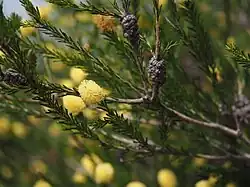 The bright yellow flowers are arranged in oval-shaped spikes, often on the ends of branches which continue to grow after flowering. The spikes contain 10 to 18 groups of flowers in threes, densely packed together, each spike up to 25 mm (1 in) long. The stamens are in five bundles around the flower, each bundle with 5 to 9 stamens. Flowering occurs in late spring and the fruit which follow are rounded, woody capsules 2–5 mm (0.08–0.2 in) long in tight clusters along the stem.[2][3]