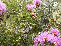 The flowers are a shade of pink to purple and are arranged in heads on the ends of branches which continue to grow after flowering. The heads contain 2 to 6 groups of flowers in threes and are up to 16 mm (0.6 in) in diameter. The stamens are arranged in five bundles around the flowers and each bundle contains 3 to 7 (but mostly 3) stamens. Flowering occurs between August and January and is followed by fruit which are woody capsules 2.5–4 mm (0.1–0.2 in) long in loose clusters.[2][3]