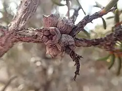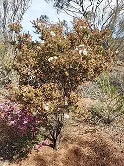 The stamens of the flowers are white but the petals are pink or red. The flowers are arranged in heads or short spikes on the ends of branches which continue to grow after flowering and sometimes also in the upper leaf axils. The heads are up to 18 mm (0.7 in) in diameter and contain 4 to 11 individual flowers. The petals are 1.5–1.8 mm (0.06–0.07 in) long and fall off as the flower ages. The stamens are arranged in five bundles around the flowers and there are 3 to 13 stamens per bundle. The main flowering period is in September and October and is followed by fruit which are woody capsules 3–4.5 mm (0.1–0.2 in) long forming loose clusters along the stems.[2][3]