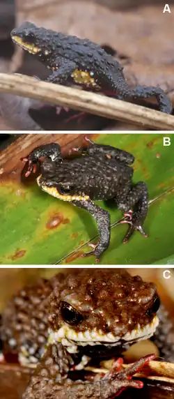Adult males measure 16.9–21.5 mm (0.67–0.85 in)[1][4] and adult females 20.5–21.5 mm (0.81–0.85 in) in snout–vent length. The snout is short. No tympanum is visible. The fingers and toes are short, slightly webbed at the base, and with rounded tips. The hands and feet are red in ventral view. The dorsum is dark brown to black with a large yellow and white strip along the maxilla, extending up to the lower half of loreal region. There are yellow spots on chest and abdomen. Dorsal skin bears medium-sized, rounded glandular warts tipped with very few spines, while the venter is covered with medium glandular warts tipped with a spine.[1]