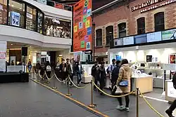 This development removed direct access to the station concourse from Swanston Street with the escalators closed in November 2003 and were replaced by escalators that direct commuters into the atrium under the cone in the centre of the shopping centre, making the path for rail passengers more convoluted. The concourse under La Trobe Street was integrated into the shopping centre with the installation of numerous shops. This development faced a lot of criticism due to the original complex which had a direct entrance to the underground concourse from the tram stop on Swanston Street removed in favour of a much longer route through the shopping centre.[33][34] The company operating Melbourne's suburban railways at the time, M>Train, together with the owners of Melbourne Central, closed this direct entrance which caused overcrowding and delays to passengers attempting to access the station platforms.[35][36][37][38]