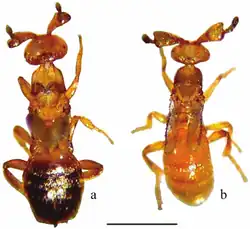 There are at least two morphs of females in M. australica which differ in the size of the abdomen, the size of the eyes and the extent of wing development. The "crawler" morph have a normal abdomen, small eyes and underdeveloped wings. The "flier" and possibly the "jumper" morphs have larger eyes and wings and a smaller abdomen. The "crawlers" remain within the host nest for the whole of their life cycle while the other morphs disperse as adults.[1]