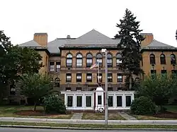 The building on West Emerson Street quickly became too small for the growing community and so at the town meeting held on February 24, 1896, the town allocated $100,000 for the building of a new high school. The town selected a lot of land known as the "Old Burial Ground" on Main Street across from the Central Fire Station as the location for the new school building. On August 1, 1898, an additional $3,000 was appropriated for site work around the building. The school was dedicated on September 17, 1898 and at the time, was one of the "finest school buildings to be found in New England".[5] Two additional wings were added to the main building and opened in 1909.[6]