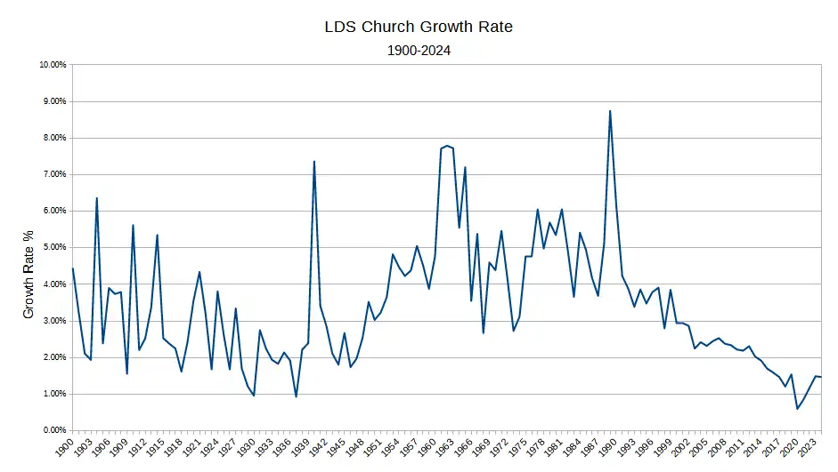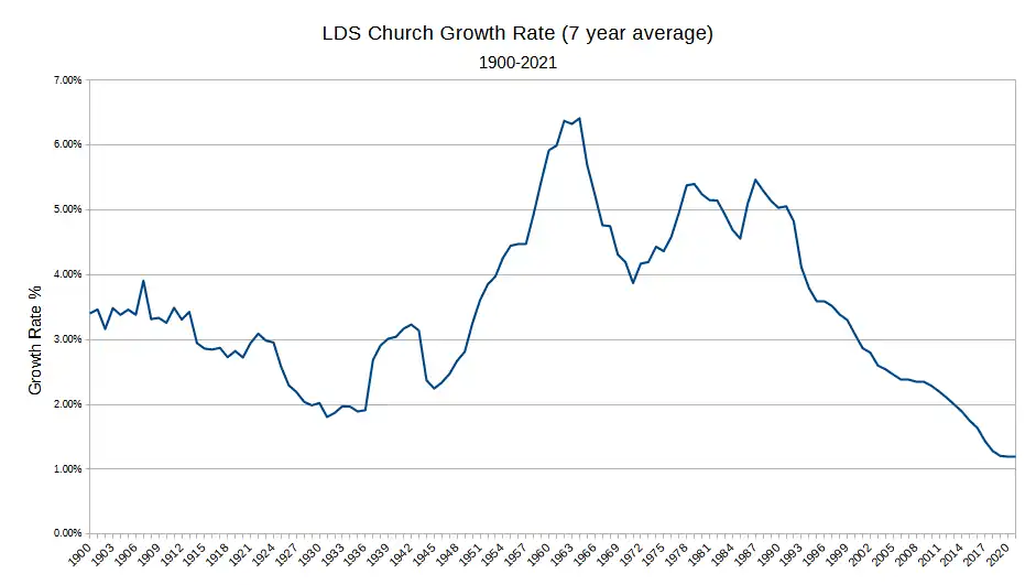 The records of the LDS Church show membership growth every decade since its beginning in the 1830s, although that has slowed significantly. Following initial growth rates that averaged 10% to 25% per year in the 1830s through 1850s, it grew at about 4% per year through the last four decades of the 19th century. After a steady slowing of growth in the first four decades of the 20th century to a rate of about 2% per year in the 1930s (the Great Depression years), growth boomed to an average of 6% per year for the decade around 1960, staying around 4% to 5% through 1990. After 1990, average annual growth again slowed steadily to a rate around 2.2% for the ten years ending 2015, approximately double the average world population growth rate of 1.1% for the same period. The growth rate has not been greater than 3% per year in the 21st century and has decelerated steadily since 2012. The rate has not been above 2% since 2013. In May 2019, however, Phil Zuckerman, Ph.D., of Psychology Today expressed skepticism of how the LDS Church reports robust growth in membership, noting that while church membership was reported to be rising, separate analysis conducted by journalist Jana Riess argued that US retention, religious participation, and belief have been decelerating since 2007.[3]