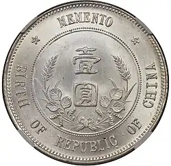 The military government of Sichuan province produced memento dollars locally from 1927 to 1930. These were based on the Nationalist government's coinage, although vary slightly in quality. Some varieties of these coins feature errors in the English typography, such as the misspelling of "REPUBLIC" as "REPUBIIC" or an upside-down T in "BIRTH".[7] The Manchurian provinces, the last to produce the Yuan Shikai dollar, ceased production in 1929, and the Memento dollar was briefly the sole legally-produced silver dollar in China; however, provincially-issued Yuan Shikai dollars continued to circulate alongside the new national currency.[8]