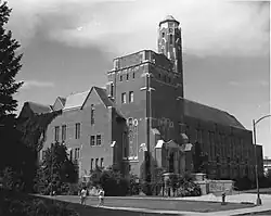 Its predecessor was the original gymnasium (and armory), located directly east;[13] constructed in 1904;[14] it has been reconfigured and continues on campus as the "Art and Architecture South" building.[15] During its time as the varsity basketball venue, it was also a library, with bookshelves along the walls.[16][17] After the Memorial Gym opened, it became the women's gym.