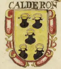 Mencía Calderón y Ocampo was born in Villa de Medellín, Badajoz (Spain) daughter of Alonso Calderón and Ana Ocampo, belonging to a noble family of Extremadura. She was married to Juan de Sanabria, a noble Spanish expeditionary who died shortly before leaving for New Spain.[2] Through his mother, Mencía Calderón, was related to Francisco Pizarro and Hernán Cortés, belonging to noble Castilian families.[3]