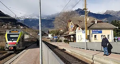 Merano–Maia Bassa/Meran–Untermais (Italian: Stazione di Merano–Maia Bassa, German: Bahnhof Meran–Untermais) is a railway station in the southwestern part of the town of Merano/Meran in South Tyrol, northern Italy. The station is on the Bolzano/Bozen to Merano/Meran line between the stations of Lana-Postal/Lana-Burgstal and Merano/Meran. It has two tracks and two low-level platforms.[1] The station building has a waiting room, bar and toilets. A commuter car park is adjacent to the station.