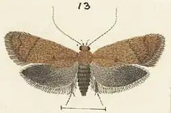 ♂. 12 mm. Head and palpi brownish. Antennal ciliations 3. Thorax fuscous. Abdomen grey. Forewings elongate, costa slightly arched, apex obtuse-pointed, termen very obliquely rounded; fuscous; stigmata obscure, dark grey, plical rather obliquely beyond first discal, an obscure ochreous-whitish dot beneath second discal : cilia light fuscous. Hindwings rather dark grey; cilia light grey, with darker subbasal shade.[6]