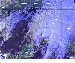 While Mitch was over eastern Mexico, it had a rainband of deep convection in the eastern periphery. With moderately warm waters and the potential for baroclinity, re-intensification was expected.[31] After emerging into the Gulf of Mexico for a second time on November 4, Mitch restrengthened into a tropical storm,[1] although it was not a purely tropical cyclone; convection was minimal near the core, and the strongest winds were over 230 mi (370 km) from the center.[32] Mitch accelerated toward the coast of Florida as it interacted with the approaching cold front.[1] On November 5, the circulation became elongated, and the NHC commented that "if [it] were not the remnants of Mitch, [they] would probably not be calling [it] a tropical cyclone."[33] The storm strengthened to reach winds of 65 mph (100 km/h) before making a final landfall in southwestern Florida near Naples. It quickly crossed the state, producing five tornadoes and tropical storm-force winds, and the storm emerged into the southwestern Atlantic Ocean.[1] Late on November 5, a Hurricane Hunters flight could not locate a well-defined center associated with Mitch, instead observing an elongated circulation embedded in the cold front. Based on the observations, the NHC declared Mitch as an extratropical cyclone.[34]