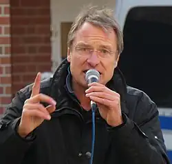 He has cited the death of his colleague Ralph Burkei in the 2008 Mumbai attacks, during which they were in contact via SMS, as an important event for his anti-Islam beliefs, while stating that he had read the Quran after the September 11 attacks.[7] He began contributing to the counter-jihad blog Politically Incorrect under the pseudonym byzanz,[8][12] and was a member of the CSU until 2011, when he left the party and joined the German Freedom Party.[7] He was elected to the federal executive board of the German Freedom Party, but due to his radical Islamophobic attitude, his election led to the resignation of several state executives and many members.[13] He had previously been relieved of his positions in the party after a blog post that called for Muslims to be forced to leave the country unless they renounced their faith.[14] In 2012, he spoke at international counter-jihad rallies in Aarhus, Denmark,[15] and in Stockholm, Sweden.[16]