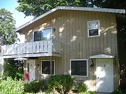 Constructed in either 1904 or 1909,[7][11] what would eventually become the main lodge was built as the vacation home of C. R. Stephens of Moline;[11] it was erected using balloon construction, along with a wooden truss roof and asphalt shingles. The four-story building, which the Stephens family christened "Lover's Lane,"[12] measured 13,000 square feet (1,200 m2) and, in its final configuration, featured 18 guest rooms as well as a kitchen and a pair of dining rooms with a capacity of 200.[8] In 1920, Whitehall resident Emanuel "Manny" Duttenhofer purchased this building, which was one of the two largest summer homes at Michillinda.[5] Initially, he intended to make it a summer retreat for his family, but after the unexpected death of his wife he instead used it to host friends and relatives. Shortly thereafter, he opened the building as a public resort and christened it the Michillinda Beach Tavern. In 1933, the resort was renamed Michillinda Beach Lodge to differentiate itself from alcohol-serving saloons, many of which renamed themselves "taverns" after the repeal of the Eighteenth Amendment to the United States Constitution. During their ownership, Duttenhofer and his sisters helped to develop Michillinda into one of the area's most frequented resorts, and the increased demand necessitated the construction of a two-story, 10-room Annex.[4]