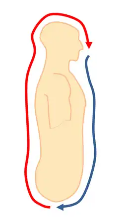 As well as the lower dantian or cauldron there are other important points along the circuit of energy flow which include the 'three gates' which are areas where it is considered that energy may stagnate, these are the wei-lu or Tailbone gate, the Dorsal gate on the back roughly level with the heart, and the Jade pillow on the back of the head.[8] Other important areas include the Ming Men or gate of fire on the back about level with the kidneys and the Baihui or Niwan which is directly on top of the head.[9]