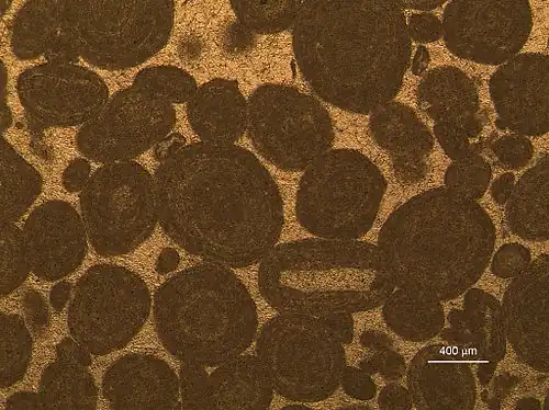 - Oolites are internally structured spheres, composed mainly by calcium carbonate (Figure 1). They are a type of constituent in limestone. The size of these ooids ranges between 0.25 and 2 mm. The name derives from the Greek ooion (egg). They are formed by growing larger and accreting material as they move around. They accomplish this either (a) by physical attachment of fine-grained material as they roll around, much in the manner of a snowball, and (b) by the chemical precipitation of material in solution, much as salt crystallizes from water during evaporation. In the former case they have thin concentric layers, and in the latter they have radiating sprays of crystals. However, a combination of both processes can be found. Microbes could contribute to their development.