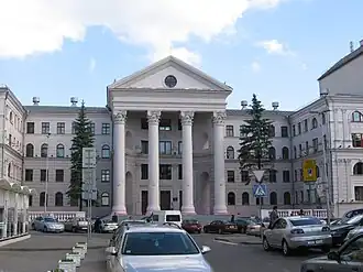 Weinberg arrived in the Soviet Union with few personal belongings aside from some of his musical manuscripts and family photographs.[32] His poor health excluded him from consideration for military service.[4] It is believed that before he settled in Minsk, he first journeyed through Brest, then Pinsk, and Luninets; he composed his Piano Sonata No. 1 in the latter town, which he nicknamed the work after. Weinberg and other recent Polish immigrants were granted Soviet citizenship by local authorities in Minsk. This permitted him the privilege to enroll at the Minsk Conservatory. He became one of Vasily Zolotarev's composition students.[32] Weinberg also studied counterpoint, music history, harmony, orchestration, and conducting.[33] His classmates included Eta Tyrmand, Genrikh Wagner, and Ryszard Sielicki. According to Lev Abeliovich, Weinberg was considered the best student.[34] He settled into a room at the conservatory's dormitory. His roommate was Alexei Klumov, a pianist and alumnus of Heinrich Neuhaus. Klumov gave lessons in the Russian language to Weinberg, who quickly became fluent.[35] After school, Weinberg worked as a pianist. He sometimes partnered in duet with Tyrmand, with whom he played medleys of themes from popular American films.[36]