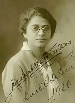 After graduating as a lawyer, she opened an office where she protected labor and women's rights, becoming the first female lawyer to open a professional practice.[2] Having started her professional practice, Acosta Cárdenas did not stop participating in the social activities in Lima that aimed to improve the condition of workers, Indians and women. Among them, her participation in the "Second Pan American Conference of Women" in December 1924 stands out.[7] There she expressed the idea of a flexible system of education for indigenous children by creating a system of "mobile rural schools". Acosta Cárdenas' participation in the circle of intellectuals, workers and Indians that had arisen around José Carlos Mariátegui between 1923 and 1930 led to the publication of this exhibition in February 1928 in the avant-garde magazine "Amauta".[5]