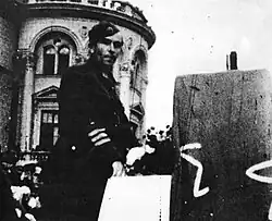 After being released from prison, Apostolski received a certificate that he was a "trustworthy Bulgarian".[10][11] Later he filed an application for appointment in the Bulgarian army.[12] He was offered the rank of captain, however he refused.[9][13] Later, General Konstantin Lukash, interceded for him, looking for a job in the Bulgarian State Railways' system, but without success.[14] Afterwards, Apostolski entered the Sofia University, where he conducted underground work.[15] In April 1942, he became a member of the Communist Party of Yugoslavia, and in June the same year he was appointed commander of the General Staff of the National Liberation Army and Partisan Detachments of Macedonia. In May 1943, he was promoted to Major General. During the Second Session of Anti-Fascist Council for the National Liberation of Yugoslavia (AVNOJ) he became a member of the Presidency of AVNOJ. In addition to the Macedonian brigades operating under his command, in February 1944, he commanded the brigades from Kosovo and Southern Serbia. He became a member of the Initiative committee for the organization of the Antifascist Assembly of the National Liberation of Macedonia (ASNOM). He participated in the First Session of the ASNOM and was elected to its presidency.[1]
