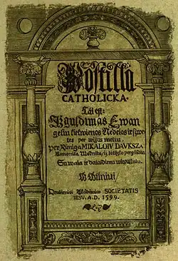 Daukša was a canon of Medininkai (nowadays Varniai) and an official member of the Samogitia.[9] Under the auspices of bishop Merkelis Giedraitis, he translated the catechism by the Spanish Jesuit theologist Jacobo Ledesma.[10] The postil, translated from the Polish translation by Jakub Wujek, was published in 1595, and became one of the means to fight paganism. Paganism was at that time still practiced in Lithuania. The work also served to counter the growing threat posed to Catholicism by the Reformation, which was promoted in Lithuania by the mighty Radziwiłł family. It was also the first book in Lithuanian to be printed in the Grand Duchy of Lithuania.[1]