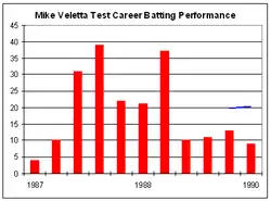 In the 1987 Cricket World Cup Veletta played a pivotal role for Australia. In the final against England he slammed 45 off only 31 balls,[1] an innings that was ultimately decisive as Australia edged out England by the narrow margin of seven runs. However at Test level he never really performed to his potential. The dogged opener got numerous starts, but failed to reach a half-century, his highest score being 39. He toured India in 1986.