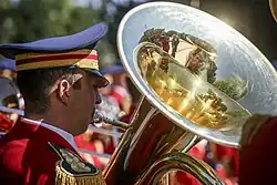 The combined band of the service (usually 170-members) have taken part in the parades in honor of the 90th, 93rd, 95th, and 100th anniversary of the Azerbaijani Armed Forces as well as organized performances in various parts of Baku on the Day of the Armed Forces of Azerbaijan.[17][18] In June 2017, the Band of the Defense Ministry performed with the Salamanca Band of the Rifles at the Azerbaijan State Philharmonic Hall.[19] In September 2018, it performed for presidents Ilham Aliyev and Recep Tayyip Erdogan in honor of the 100th anniversary of the Liberation of Baku. At around the same time, a CD was released by the Exemplary Band that includes a number of military marches performed by the band and its soloists.[8] In August 2019, the higher military academy band took part in the Spasskaya Tower Military Music Festival and Tattoo, representing Azerbaijan for the first time.[20]