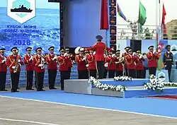 In the early days of the establishment of the Azerbaijani National Army of the Azerbaijan Democratic Republic, a military band was created in a short period of time. The first military parade in Baku in 1919 was accompanied by a military band.[1] Military bands have always existed in the history of the Azerbaijan Soviet Socialist Republic. During Yusif Akhundzade's service as director of the school band of the Caspian Higher Naval School (later known as the Azerbaijan Higher Naval Academy), it participated in the 1971 and 1983 October Revolution Day Parade on Moscow's Red Square.[2] In 1971, the band's performance on Kutuzovsky Prospekt featured the famous Azeri march Vatan by composer Alimardan Aliyev, which was one of the few times oriental music was played at a military parade in Moscow.[3] A band was also maintained in the Baku Higher Combined Arms Command School.[4]