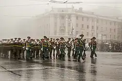Over 1,000 musicians of the service divided into 40 bands[22] participate in the annual Victory Day parades and before 1991 the October Revolution and May 1 parades as well.[23] The service is an active sponsor of the annual Spasskaya Tower Military Music Festival and Tattoo in Moscow. Joint military concerts are commonly held between the bands of the service and foreign military bands on Russian and foreign soil. Mass events were held on the service's tricentennial in 2011. Every couple of years, officials from the service conduct contests to identify the best bands in the service as well as inspections to identify those that retain the standard for bands.[24] In 1928, the first national competition of military bands being held.[25]