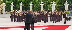 The Military Music Band of the Armed Forces of the Slovak Republic (Slovak: Vojenská hudba Ozbrojených síl Slovenskej republiky) is a musical element of the Bratislava Military Command of the Slovak Armed Forces that serves as the primary military band in the Slovak Republic. It accompanies the Honour Guard of the President of the Slovak Republic military and national ceremonies, military oaths, and state funerals, all of which are protocol events. It also represents the military of Slovakia in festive events such as military tattoos and symphonic concerts. On July 1, 2009, it has been under the command of the Bratislava Garrison Headquarters, which was part of the Training Force and Support of the Armed Forces of the Slovak Republic. Exactly 5 years later, the Chief of Staff of the Slovak Ground Forces put the band under its jurisdiction. The director and commanding officer of the band is currently Major Peter Apolen, who has been serving in this position since 2005.[1][2][3]