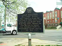 During the Civil War, Union soldiers were encamped at the park. Governor Oliver P. Morton renamed the park Camp Sullivan, after the 13th Indiana Infantry's Colonel Jeremiah C. Sullivan. It was the first designated camp for the Federal army in Marion County, Indiana. However, this use severely damaged the grounds, due to the different troops entering and leaving Camp Sullivan, as it was a marshaling center. Following the war, efforts by local resident George Merritt started to improve the grounds, with the addition of a fountain and a small pool with a rock foundation of considerable size. Relics from the war and playground equipment were also added, as was a pavilion that still stands.[6][7]